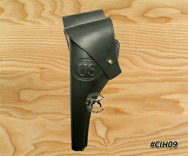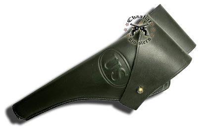 A replica of the M1917 Revolver Holster as issued to U.S. troops in WWI & WWII. Top quality black leather construction with large U.S. embossed on holster front.