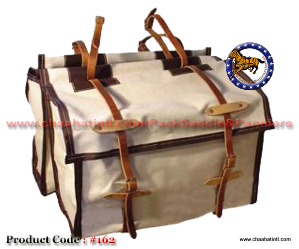 Leather and Canvas Pannier Set w/ logo 30o oz # 4 Duck canvas, with Leather Piping All Over the Edges. Pannier Compartments: 24"W x 18"H x 14"D